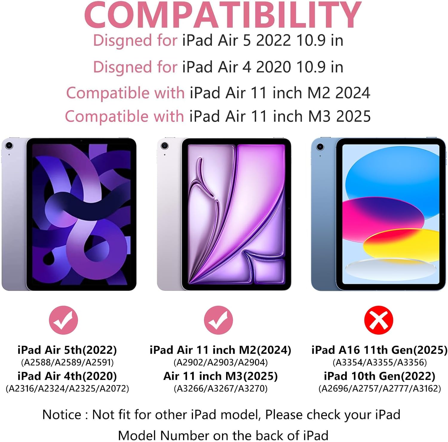- For iPad Air 11 inch Case with Keyboard: This for ipad air keyboard case compatible with iPad Air 11-inch M3 2025 (A3266/A3267/A3270), compatible with iPad Air 11-inch M2 2024 (A2902/A2903/A2904), compatible with iPad Air 5th Generation 10.9 inch 2022 (A2588/A2589/A2591), compatible with iPad Air 4th Generation 2020 ( A2072/A2316/A2324/A2325 ), compatible with iPad Pro 11 inch 1st Generation 2018 (A1980/A2013/A1934). οΌ Please kindly check the model number on the back of iPad before purchasing.οΌ