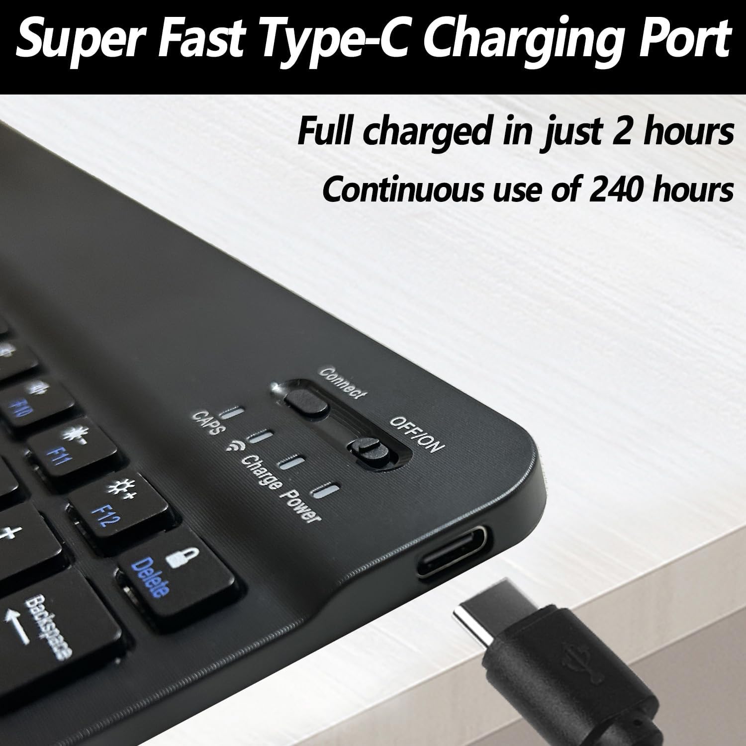 - Rechargeable and Long-life Battery: This keyboard has a built-in large-capacity rechargeable battery, which is more energy-saving and lower consumption. You can use it for at least 360 hours. It can be fully charged in 2.5 hours using a Type-C charging cable, which is very convenient