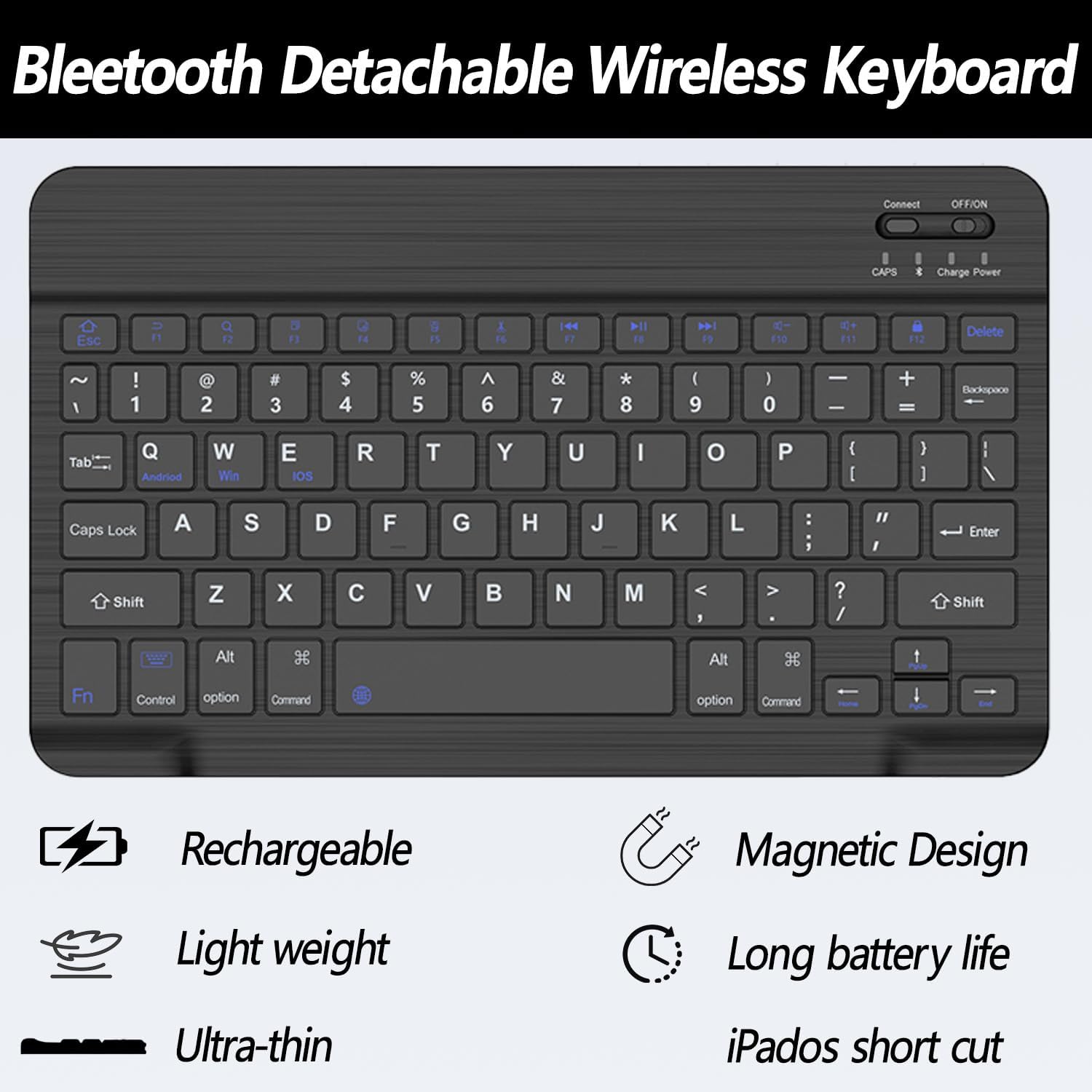 - Detachable Wireless Keyboard: This detachable Bluetooth keyboard can be magnetically attach to the iPad protective case and can be removed when not needed. Ergonomic keys with rebound function to reduce noise for a comfortable typing experience