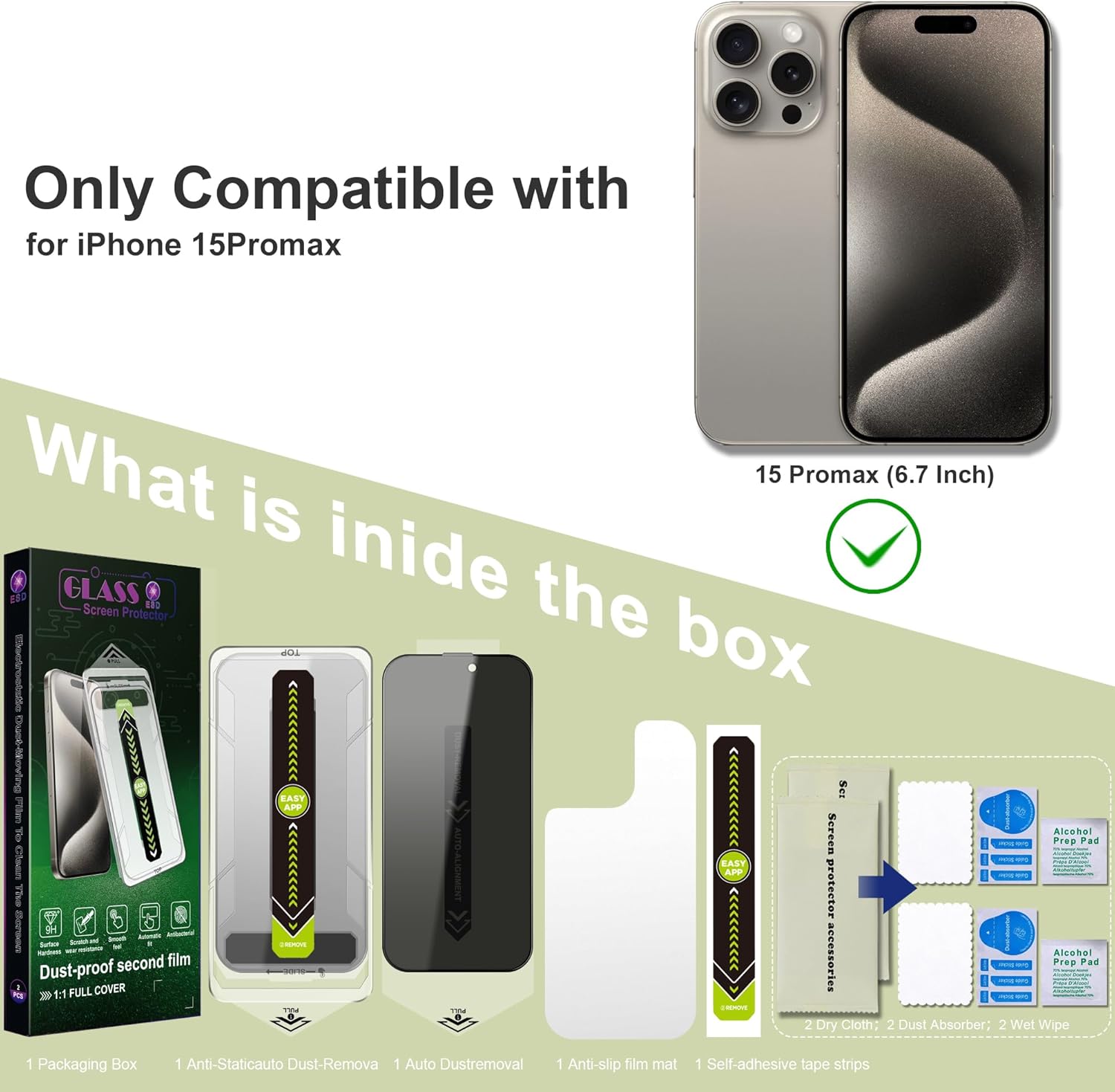 (2-Pack Anti-Spy Privacy Screen Protector for iPhone 15 Pro Max(6.7-Inch),9H Tempered Glass,Full Coverage,Anti-Fingerprint,Auto Dust Removal,Bubble-Free,Easy Installation