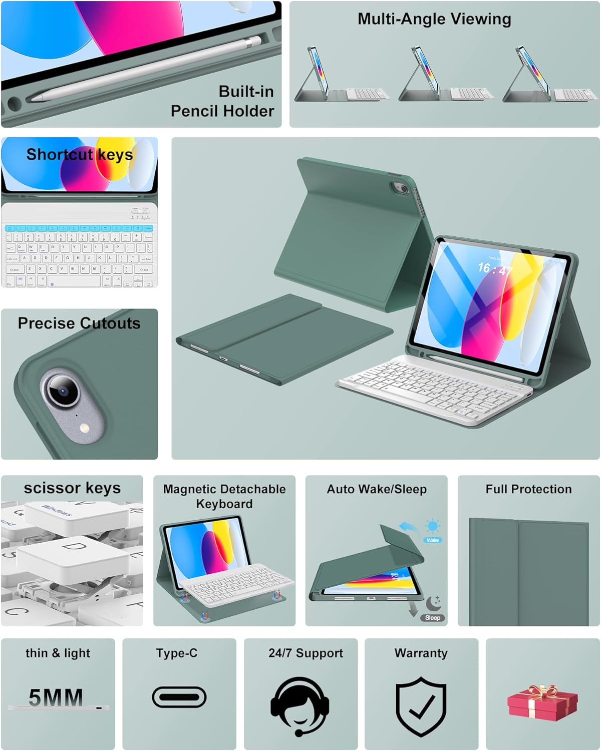 Keyboard Case for iPad 10th Generation 2022 10.9-inch - Rechargeable Detachable Wireless Bluetooth Keyboard - Smart Folio Cover with Pencil Holder for 10.9 inch Apple iPad 10th Generation, Dark Green