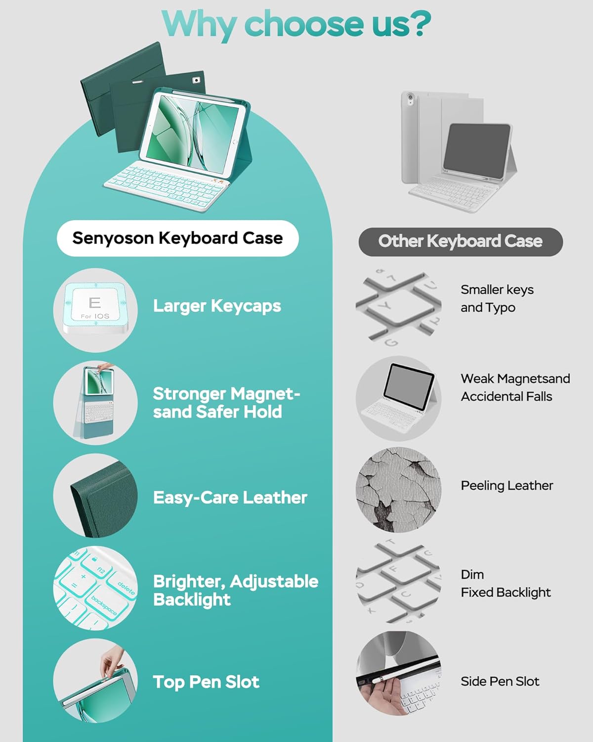 - ăPremium MaterialăSenyoson for ipad keyboard case is made of good quality PU. Soft, smooth and it gives a luxurious feeling. The interior case is made of high-quality flexible TPU with honeycomb heat dissipation. Keyboard case can protect your tablet from drops and scratches. Precise cutout allows full access to all ports, sensors, speaker, microphone and camera