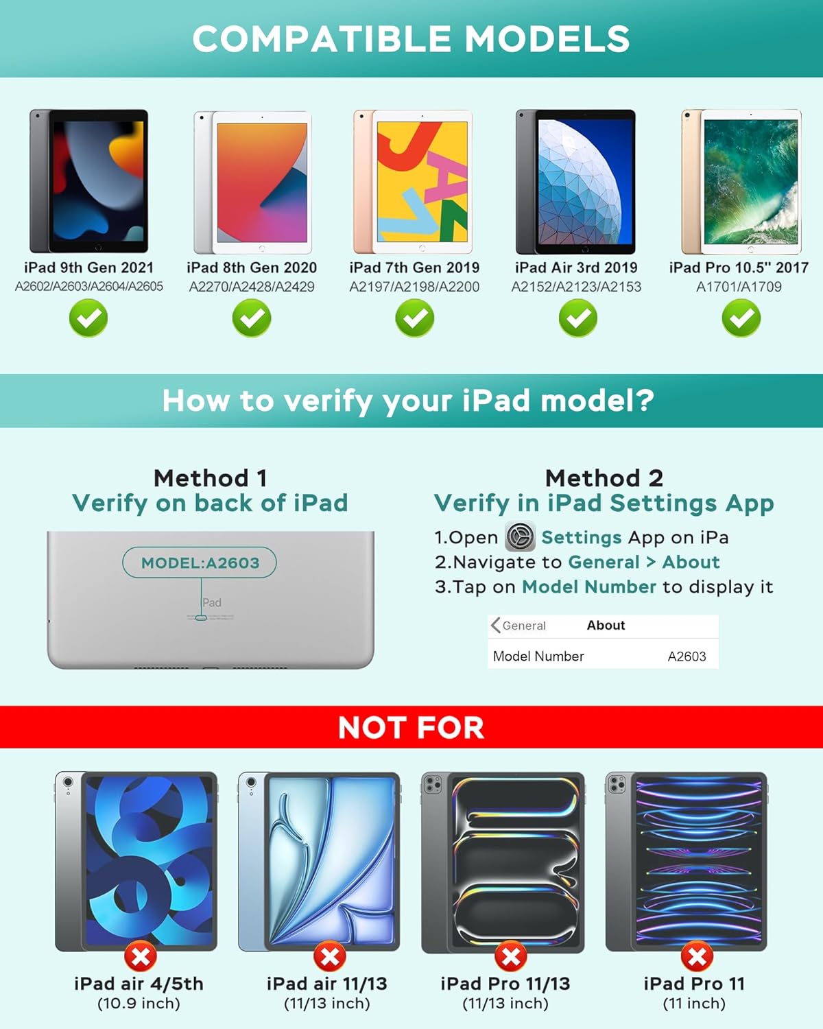 - ăFor ipad Case with Keyboard 10.2/10.5 InchăThis keyboard case compatible with iPad 9th Generation 10.2inch 2021(Model Number:A2602/A2603/A2604/A2605), compatible with iPad 8th Generation 10.2inch 2020(Model Number:A2270/A2428/A2429/A2430), compatible with iPad 7th Generation 10.2inch 2019(Model Number:A2200/A2197/A2198), compatible with iPad Air 3rd Generation 10.5inch 2019(Model Number:A2123/A2152/A2153/A2154) and compatible with iPad Pro 10.5inch 2017(Model Number: A1701/A1709/A1852). Please check the model number starting with "A" on the back of your tablet before purchasing