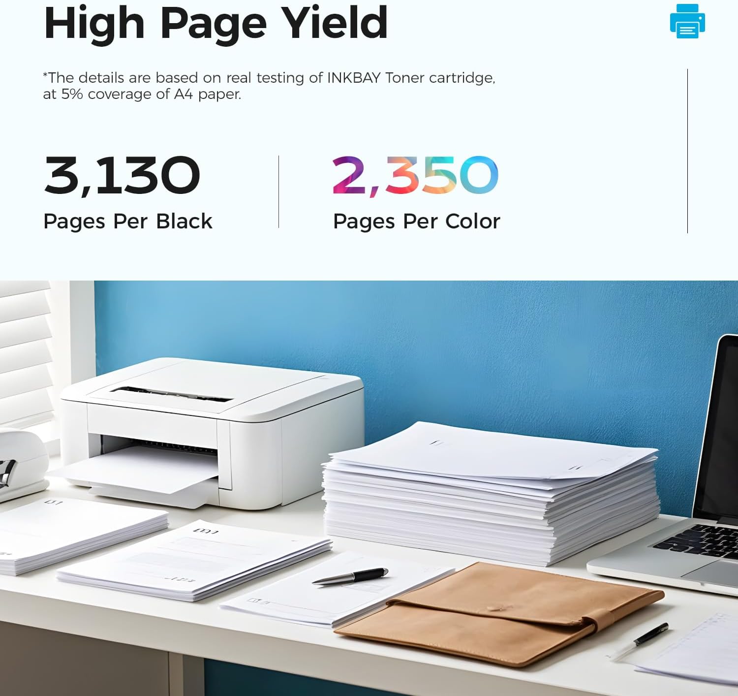 - High Page Yield: Black yields up to 3,130 pages, Cyan/Magenta/Yellow yields up to 2,530 pages each (at 5% coverage of Letter A4)
